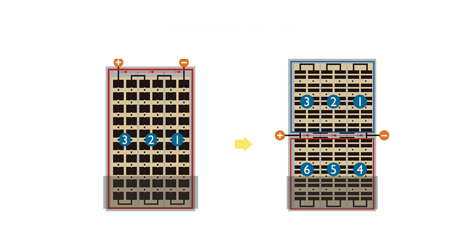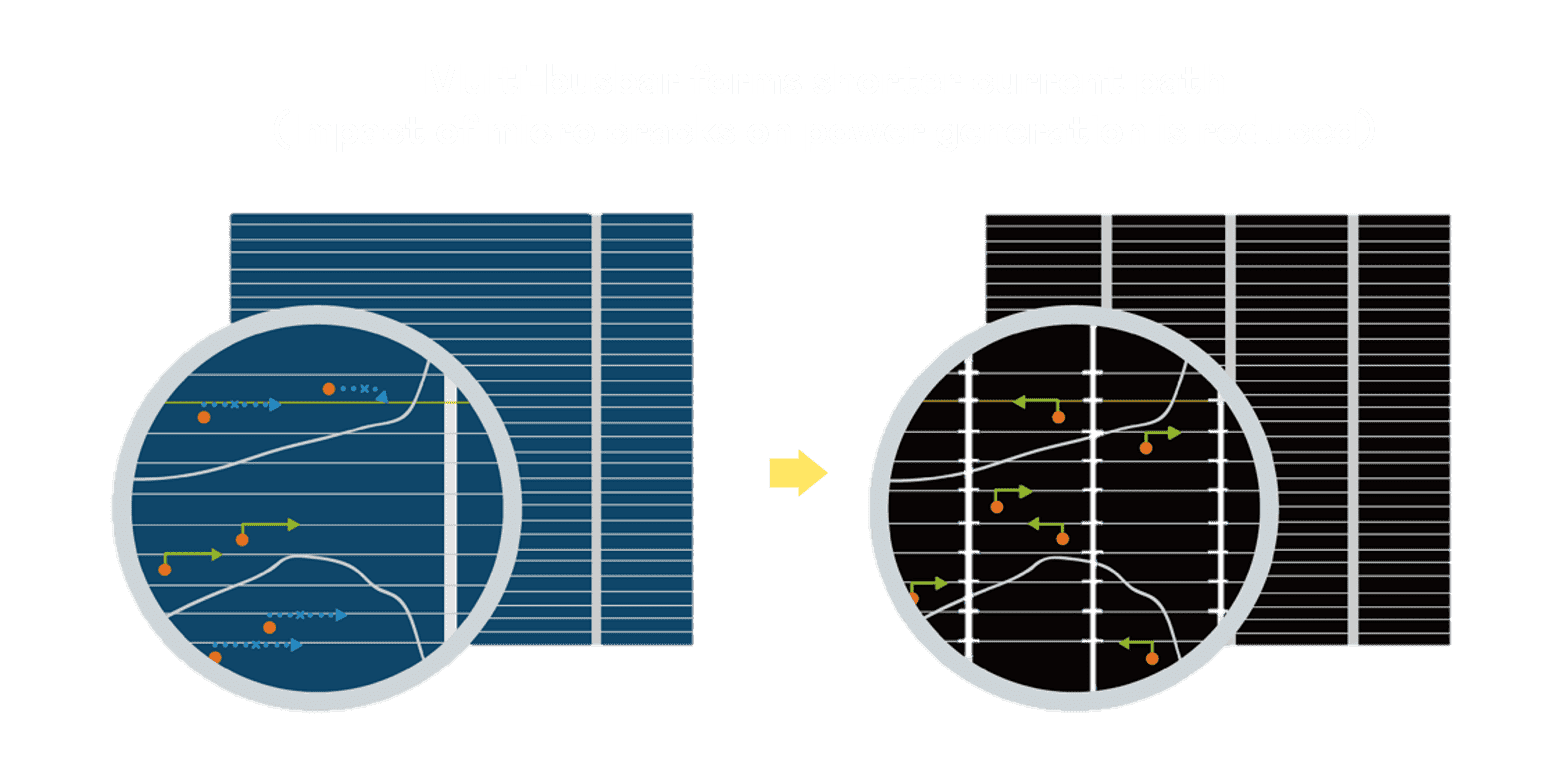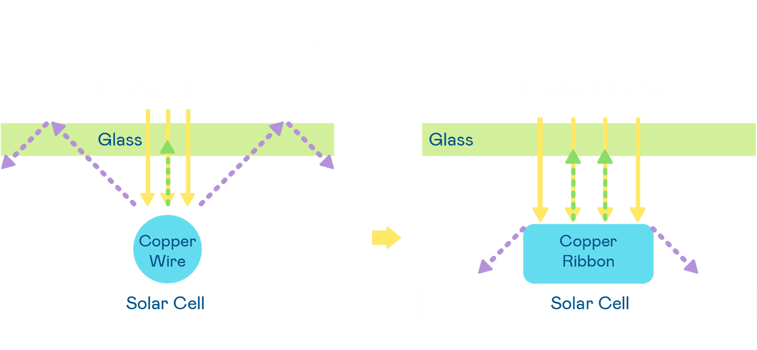 - 电池使用多条铜导线 (Copper wire) 于电池片上形成较短的电流路径,,,提高电流收集效率,,,采用圆形设计的铜导线较传统扁平式的铜焊带 (Ribbon),,,可增加入射至电池的光线量。。
