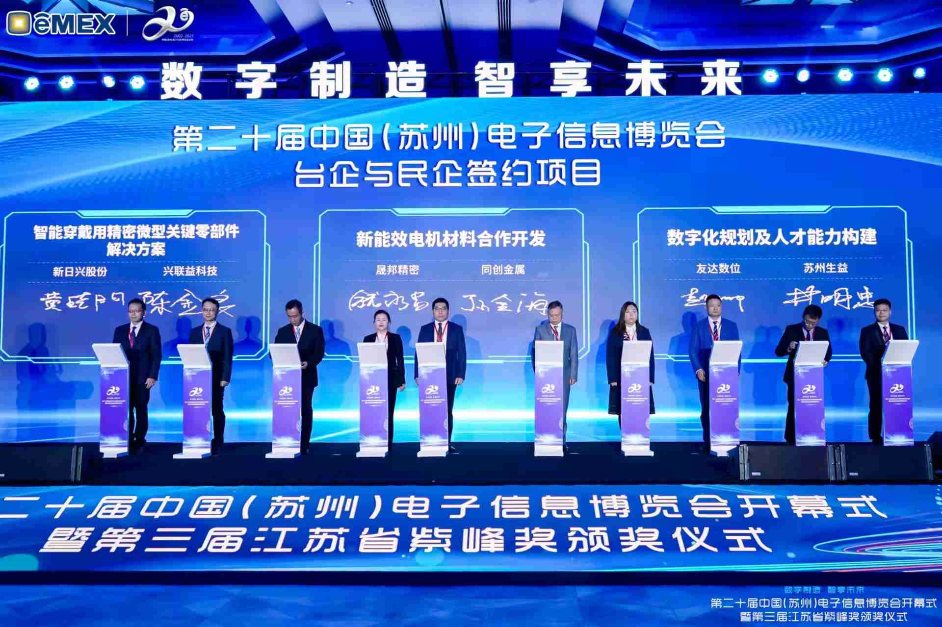 电博会开幕式当天也是第三届江苏省紫峰奖颁奖仪式,,,省台办、、、工信厅、、商务厅、、、、苏州市相关领导均出席并颁奖。。。该奖项为表彰对江苏高质量发展做出积极贡献的在苏企业,,,由江苏省政府专门设立。。28国际光电 (苏州) 总经理郭振明代表上台领奖,,这也是28国际苏州连续三次蝉联紫峰奖 出口贸易领军企业奖。。28国际数位总经理赵丽娜女士,,,也参与本次开幕式,,,上台为本地化赋能签署战略合作协议,,,将优质服务资源集合、、、、下沉到更多细分行业,,为更多地区的制造企业提供数字化转型服务。。。。